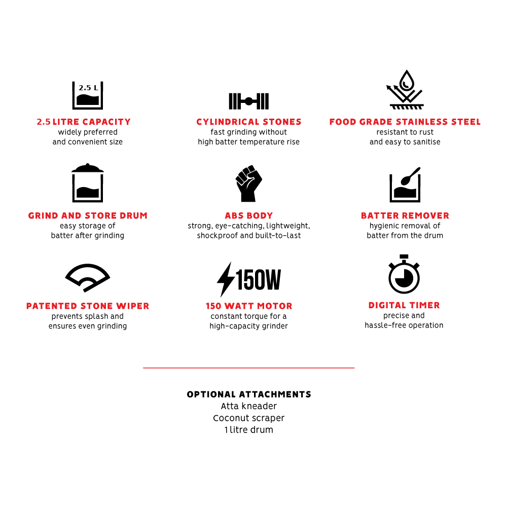 The 2.5 litre compact Classic is sure to find a large place in your heart and a small corner in your kitchen. Loaded with features that are a perfect blend of health and taste, the highlights of Classic is 150 Watt motor, ABS body, food grade stainless steel, and grind & store drums.